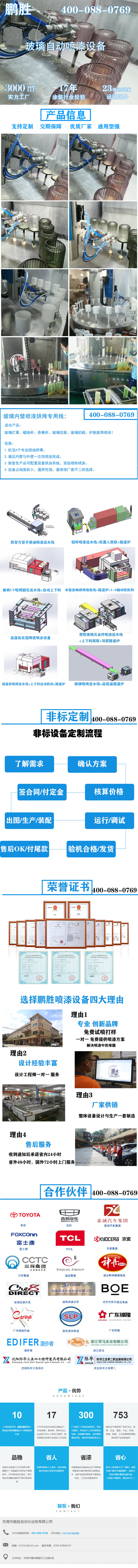 玻璃内壁喷漆烘烤专用线:适合产品:玻璃灯罩、蜡烛杯、香薰杯、玻璃花瓶、玻璃奶瓶、护肤瓶等喷涂!优势:1.机顶4个专业喷油师傅。2.满足内壁与外壁一次性喷涂完成。3.渐变色产品可配置双套供油系统,双组喷枪喷涂。4.设备占地面积小,通用性强,是喷漆厂家不二的选择。