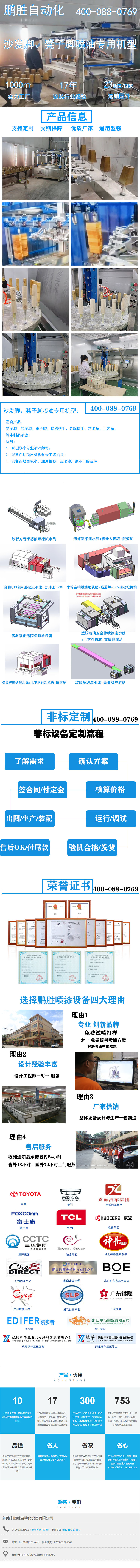 沙发脚、凳子脚喷油专用机型:适合产品:凳子脚、沙发脚、桌子脚、楼梯扶手、走廊扶手、艺术品、工艺品、等木制品喷涂!优势:1.1机顶4个专业喷油师傅。2. 配置自动顶压机构省去工装治具。3.设备占地面积小,通用性强,是喷漆厂家不二的选择。