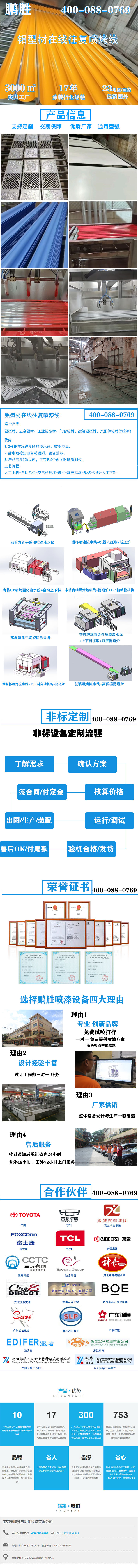 铝型材在线往复喷漆线:适合产品:铝型材、五金铝材、工业铝型材、门窗铝材、建筑铝型材、汽配件铝材等喷漆!优势:1.2-8枪在线往复喷烤流水线,效率更高。2.静电喷枪油漆自动吸附,更省油漆。3.产品高度5CM以内,可实现5个面同时喷漆到位。工艺流程: 人工上料-自动除尘-空气枪喷漆-流平-静电喷漆-烘烤-冷却-人工下料