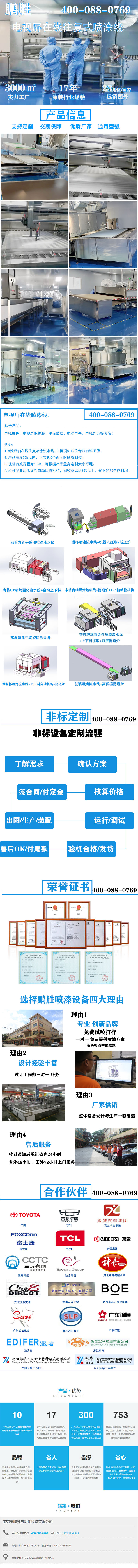 电视屏在线喷漆线:适合产品:电视屏幕、电视屏保护膜、平面玻璃、电脑屏幕、电视外壳等喷涂!优势:1.8枪双轴在线往复喷涂流水线,1机顶8-12位专业喷漆师傅。2.产品高度5CM以内,可实现5个面同时喷漆到位。3.现机有效行程为1.2M,可根据产品量身定制大小行程。4.还可配置油漆涂料自动回收机构,回收率高达85%以上,省下的都是存利润。