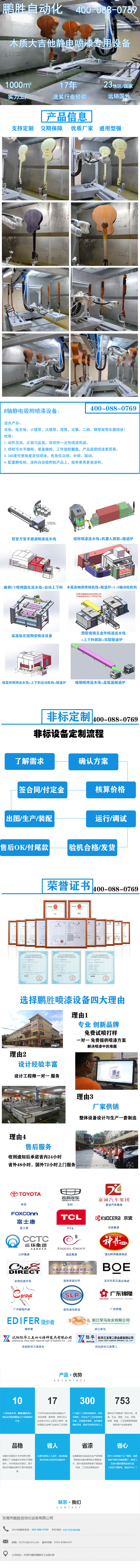 8轴静电吸附喷漆设备:适合产品:吉他、电吉他、小提琴、大提琴、琵琶、古筝、二胡、钢琴架等乐器喷涂!优势:1.动作灵活,正面与反面,异形件一次性喷涂完成。2.喷枪可水平摆枪、垂直摆枪,工件旋转翻盘,产品底部喷涂更简易。3.360度任意角度定位喷涂,死角位点喷、补喷、联动。4.配置静电枪,涂料自动吸附到产品上,效率更高更省涂料。