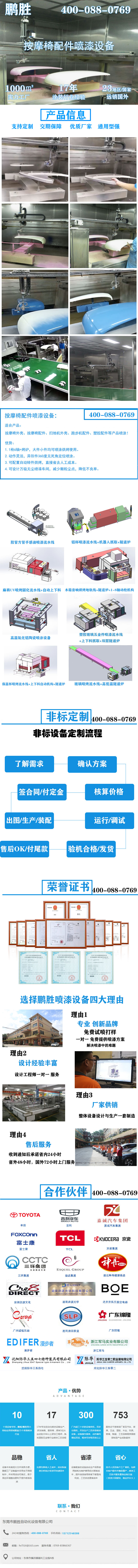 按摩椅配件喷漆设备:适合产品:按摩椅外壳、按摩椅配件、扫地机外壳、跑步机配件、塑胶配件等产品喷涂!优势:1.1枪6轴+烤炉,大件小件均可喷涂烘烤使用。2.动作灵活,异形件360度无死角定位喷涂。3.可配置自动转件烘烤,直接省去人工成本。4.可设计万级无尘喷漆车间,减少颗粒尘点,降低不良率。