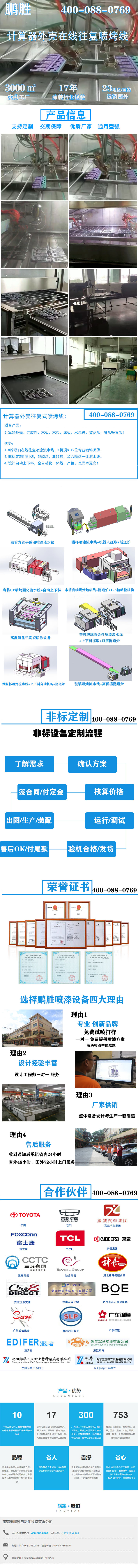 计算器外壳往复式喷烤线:适合产品:计算器外壳、硅胶件、木板、木架、床板、水果盘、披萨盘、餐盘等喷涂!优势:1.8枪双轴在线往复喷涂流水线,1机顶8-12位专业喷漆师傅。2.非标定制1喷1烤,2喷2烤,3喷3烤,加UV喷烤一体流水线。4.设计自动上下料,全自动化一体线,产值、良品率更高!