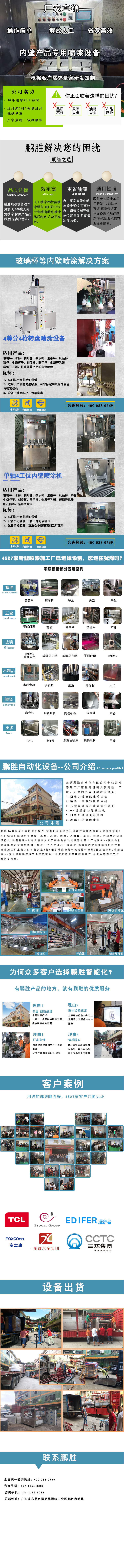 内壁喷涂设备:适用产品:玻璃杯、水杯、咖啡杯、茶水杯、泡茶杯、礼品杯茶杯、牛奶杯子、刻度杯、玻璃管等产品的内壁喷涂优势:1、1机顶4个专业喷油师傅2、适用于产品的内壁喷涂,可非标定制喷涂渐变色与带顶机构3、设备占地面积小,价格实惠