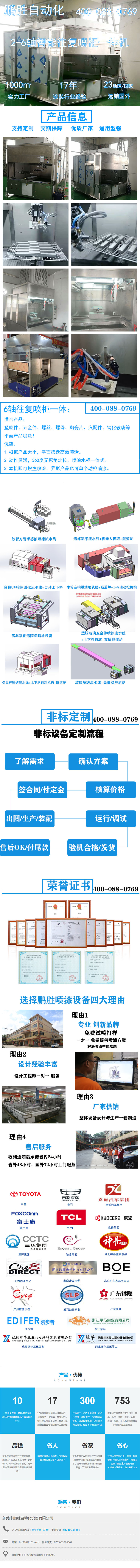 6轴往复喷柜一体:适合产品:塑胶件、五金件、螺丝、螺母、陶瓷片、汽配件、钢化玻璃等平面产品喷涂!优势:1.根据产品大小,平面摆盘高效喷涂。2.动作灵活,360度无死角定位,喷涂水柜一体式。3.本机即可摆盘喷涂,异形产品也可单个动枪喷涂。