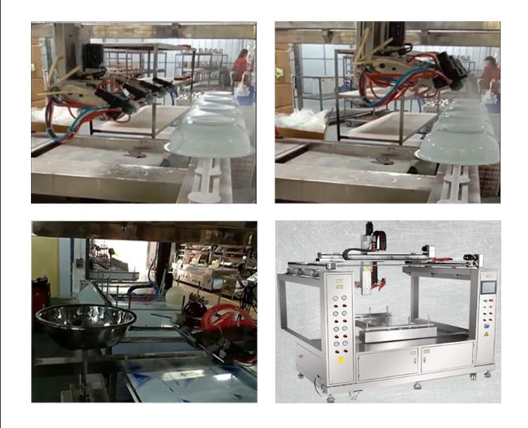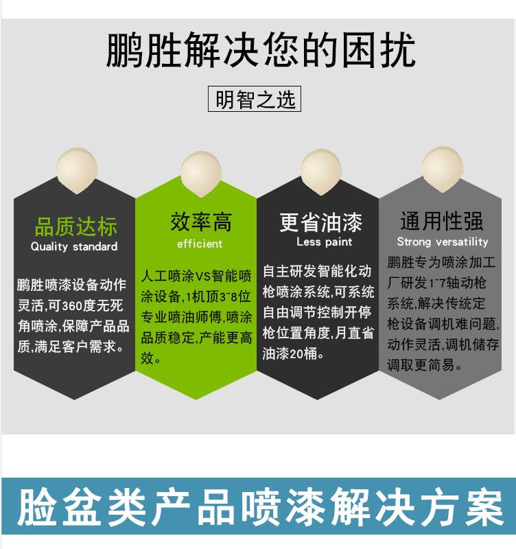 4枪6轴脸盆喷漆适用产品:不锈钢脸盆.硅胶盆.洗水盆.洗菜盆.浴室盆.家用盆.塑胶盆.沥水盆.塑料盆等表面喷涂处理,异性件 圆形件 长方形 正方形,椭圆形等都可以喷,这台机拥有喷漆工的思维逻辑,动作灵活同时还结合了传统定枪,传统往复机,机器人的功能市面上90%以上的产品都可以喷涂!