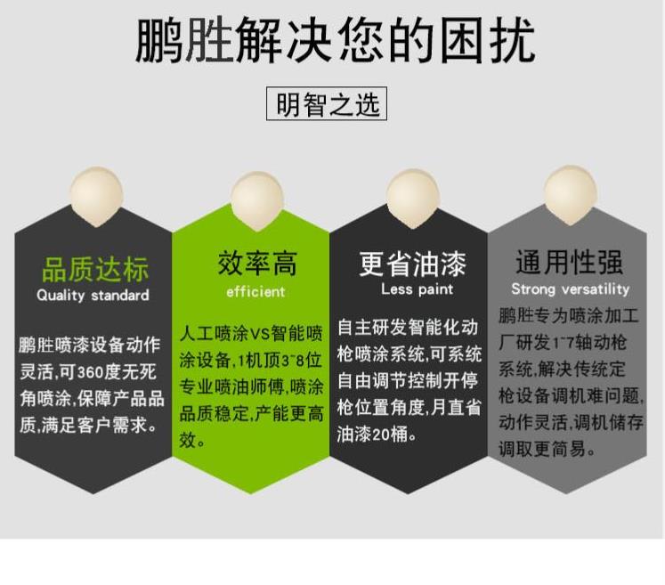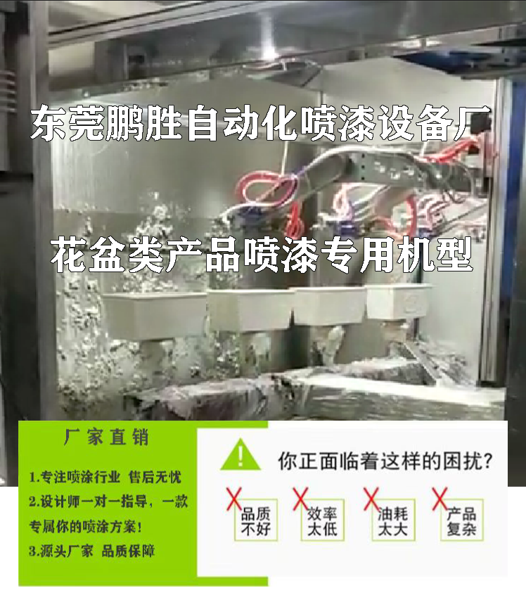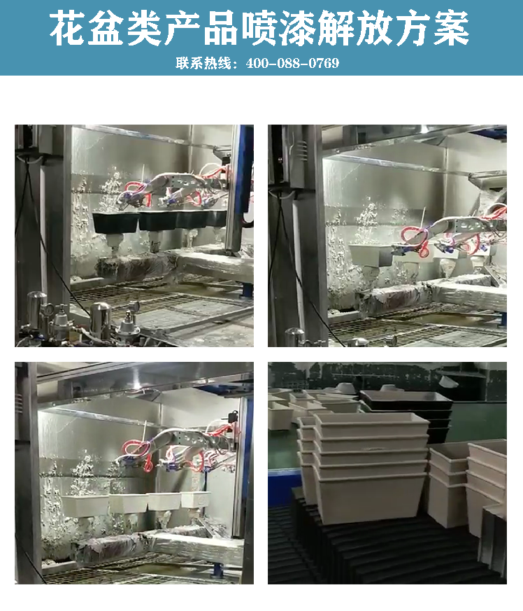 4枪6轴喷漆设备:适合产品:塑胶花盆、陶瓷花盆、水泥花盆、长方形花盆、圆形花盆、扁形花盆、工艺花瓶、玻璃花瓶等喷漆!优势:1. 4枪6轴+烤炉,实现喷烤一体线。2. 动作灵活,360度无死角一次性喷涂到位。3. 可搭配自动上下料,直接省去人工本。