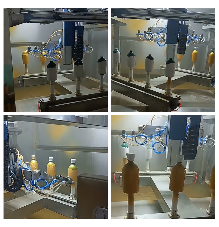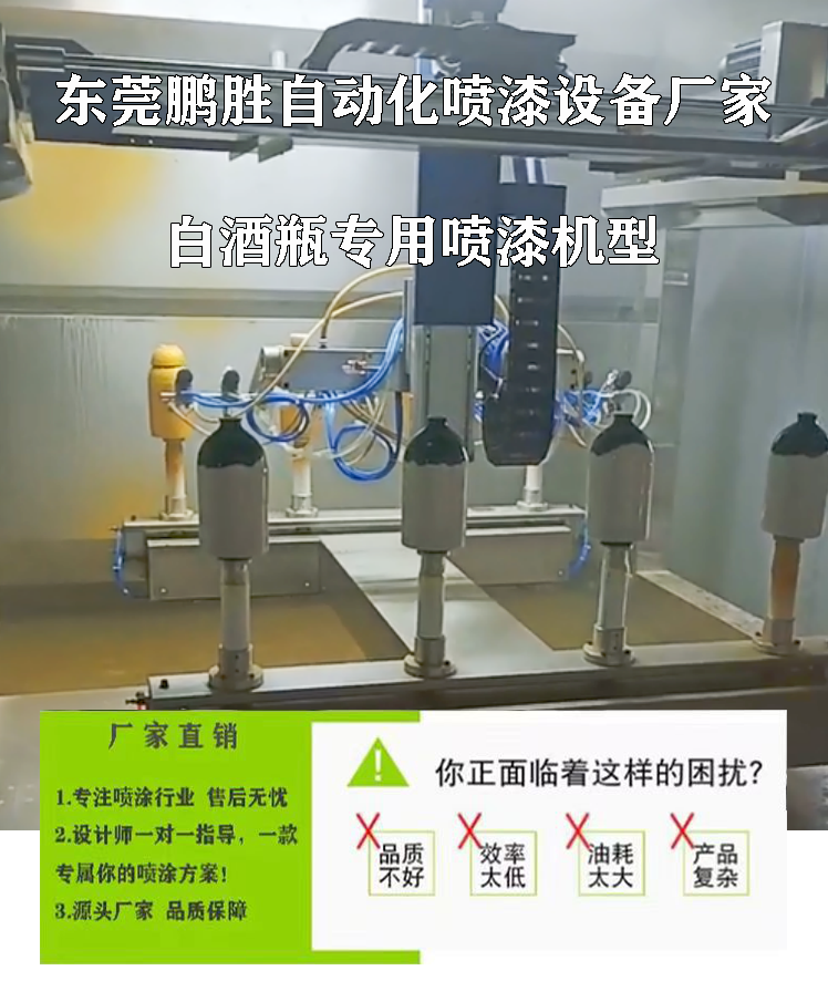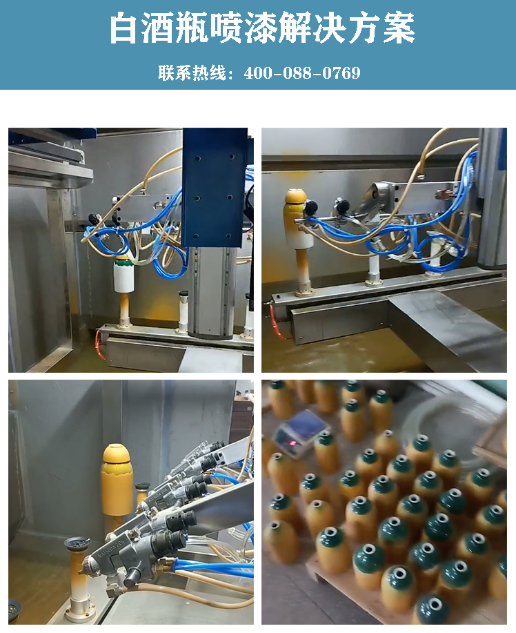 4枪6轴喷漆设备:适合产品:陶瓷酒瓶、白酒瓶、陶瓷酒壶、陶瓷茶壶、陶瓷餐具、陶瓷茶具、陶瓷水杯等喷涂!优势:1.1机顶4个专业喷油师傅。2.动作灵活,360度无死角一次性喷涂到位。3.配置真空吸盘,平底产品无需夹具,直接省去治具成本。